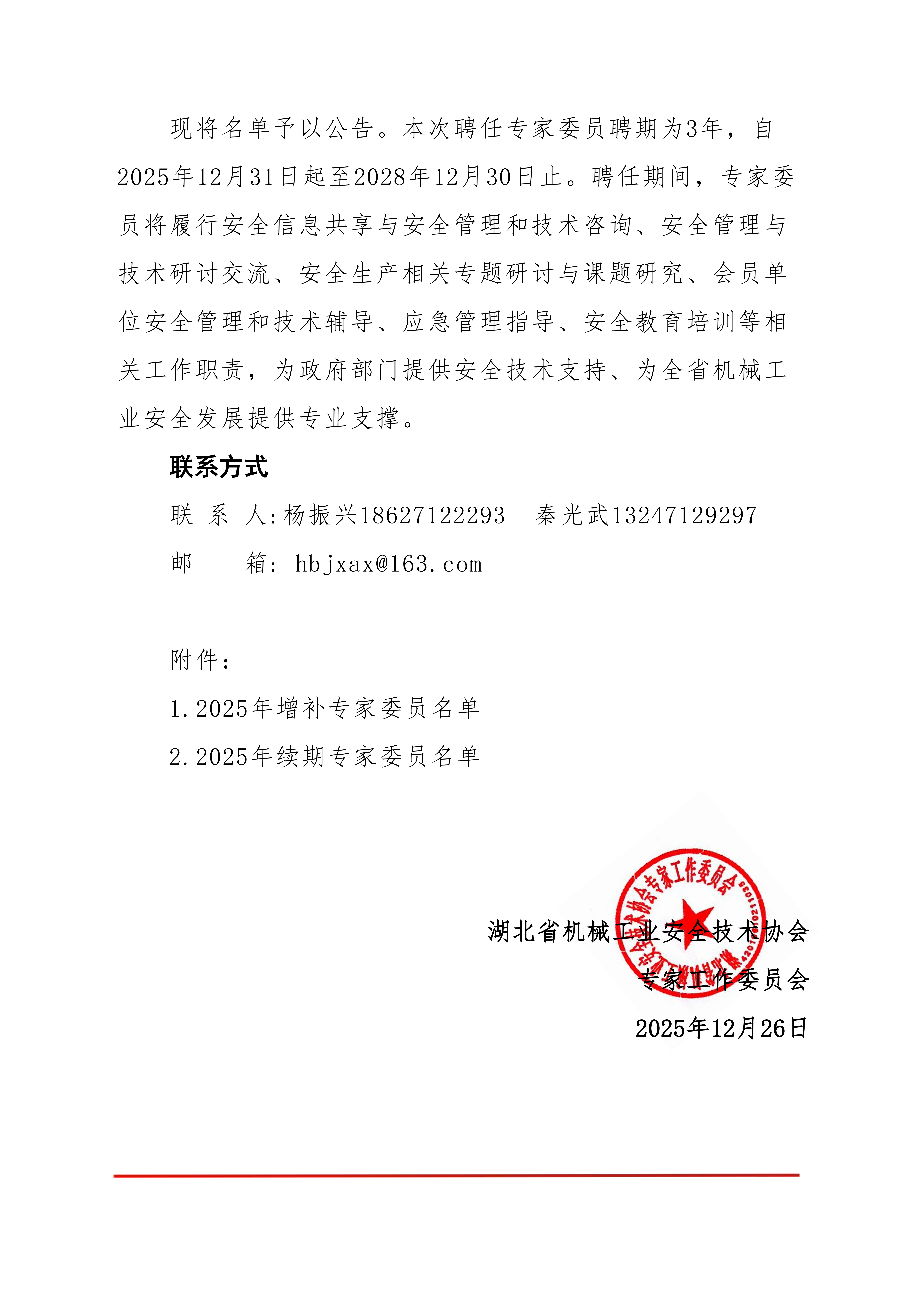 根据《关于湖北省机械工业安全技术协会专家工作委员会委员增补的通知》(鄂机安协专委会(2025)1号)、《关于专家工作委员会委员续期申报的通知》(鄂机安协专委会(2025)2号)安排,专委会组织开展了专家委员增补及续期遴选工作。经个人申报、单位推荐、资格审核、专家评审等环节,现将本次增补及续期专家委员名单予以公示(详见附件)。公示期为2025年26日至2025年12月30日。