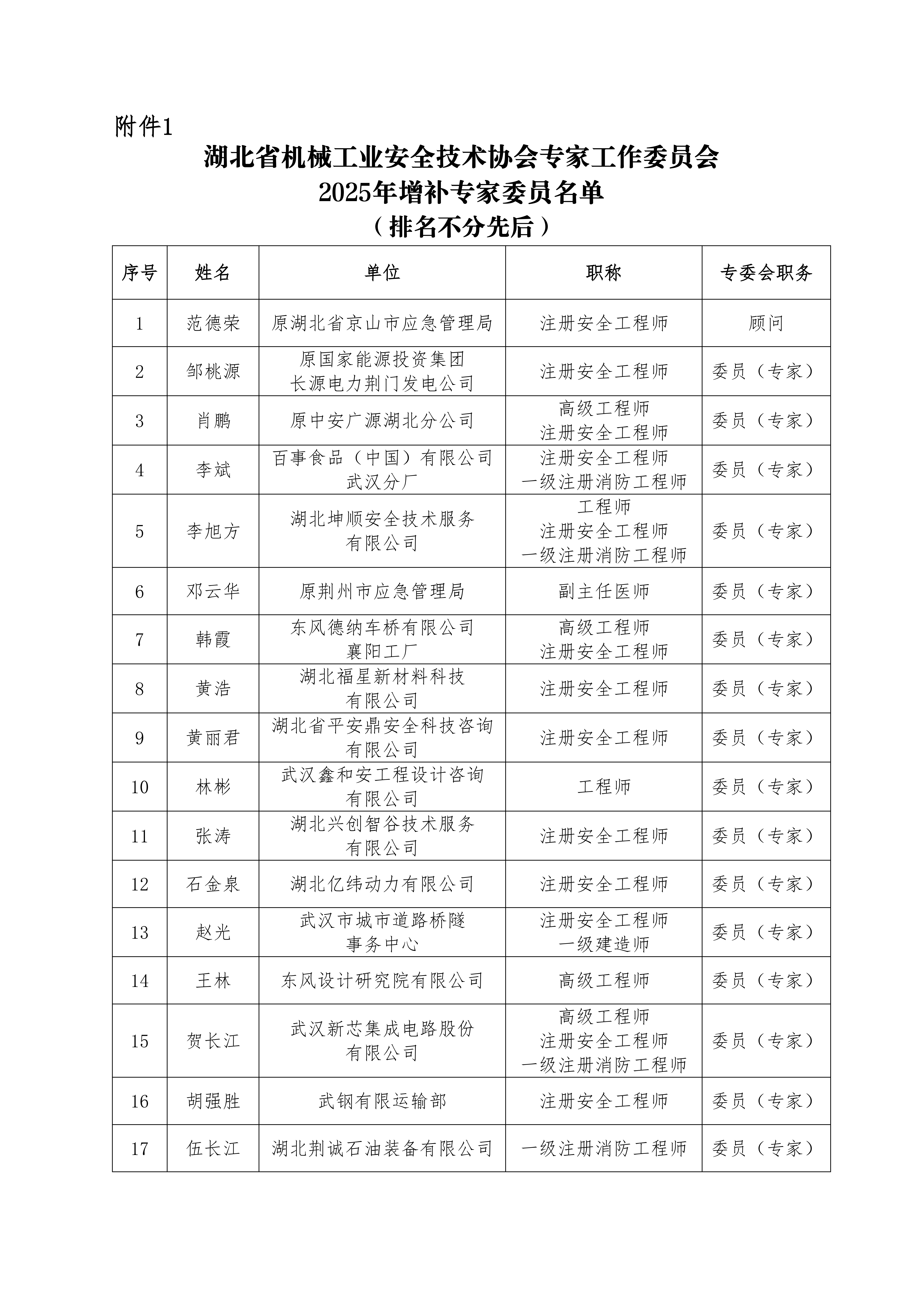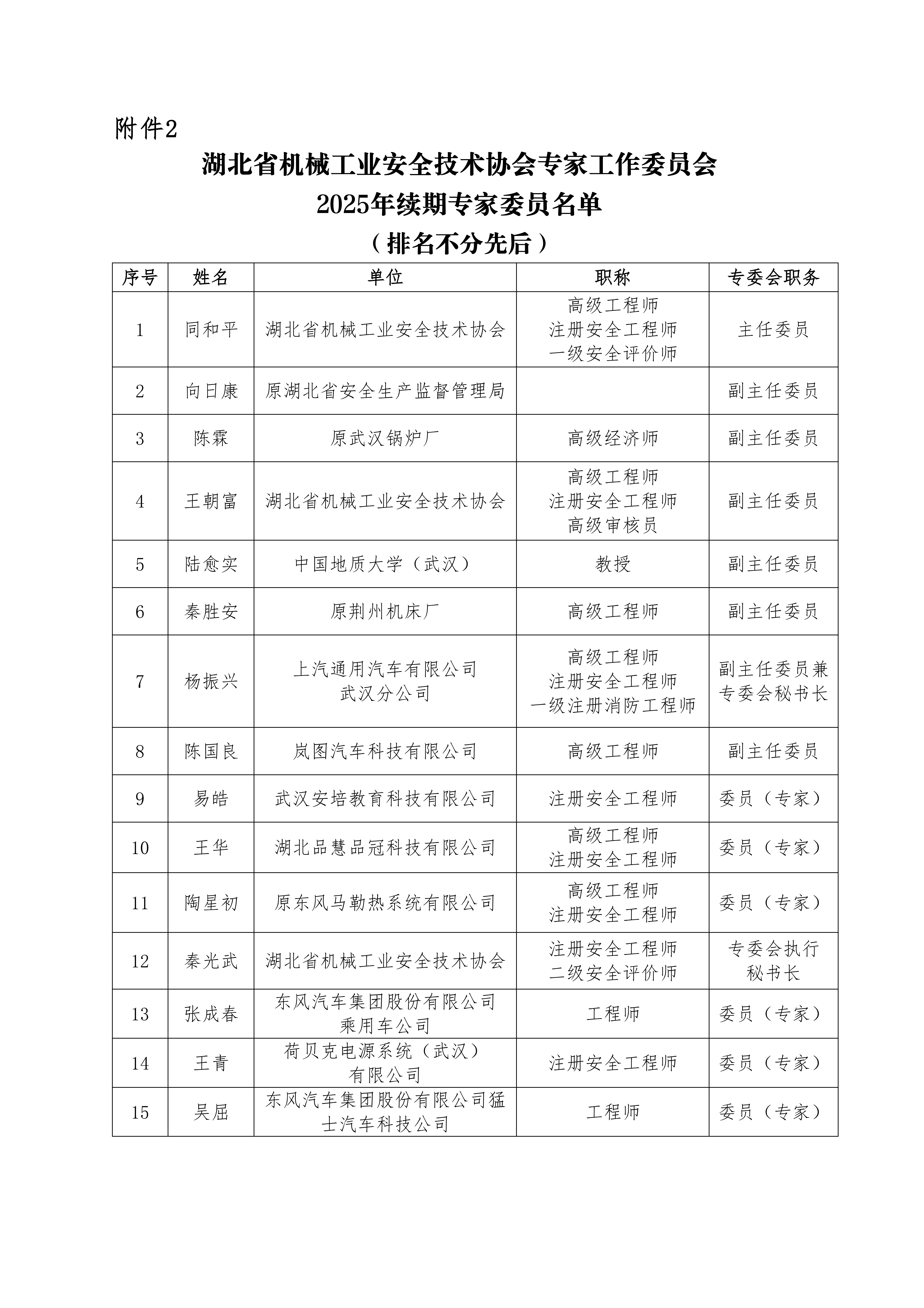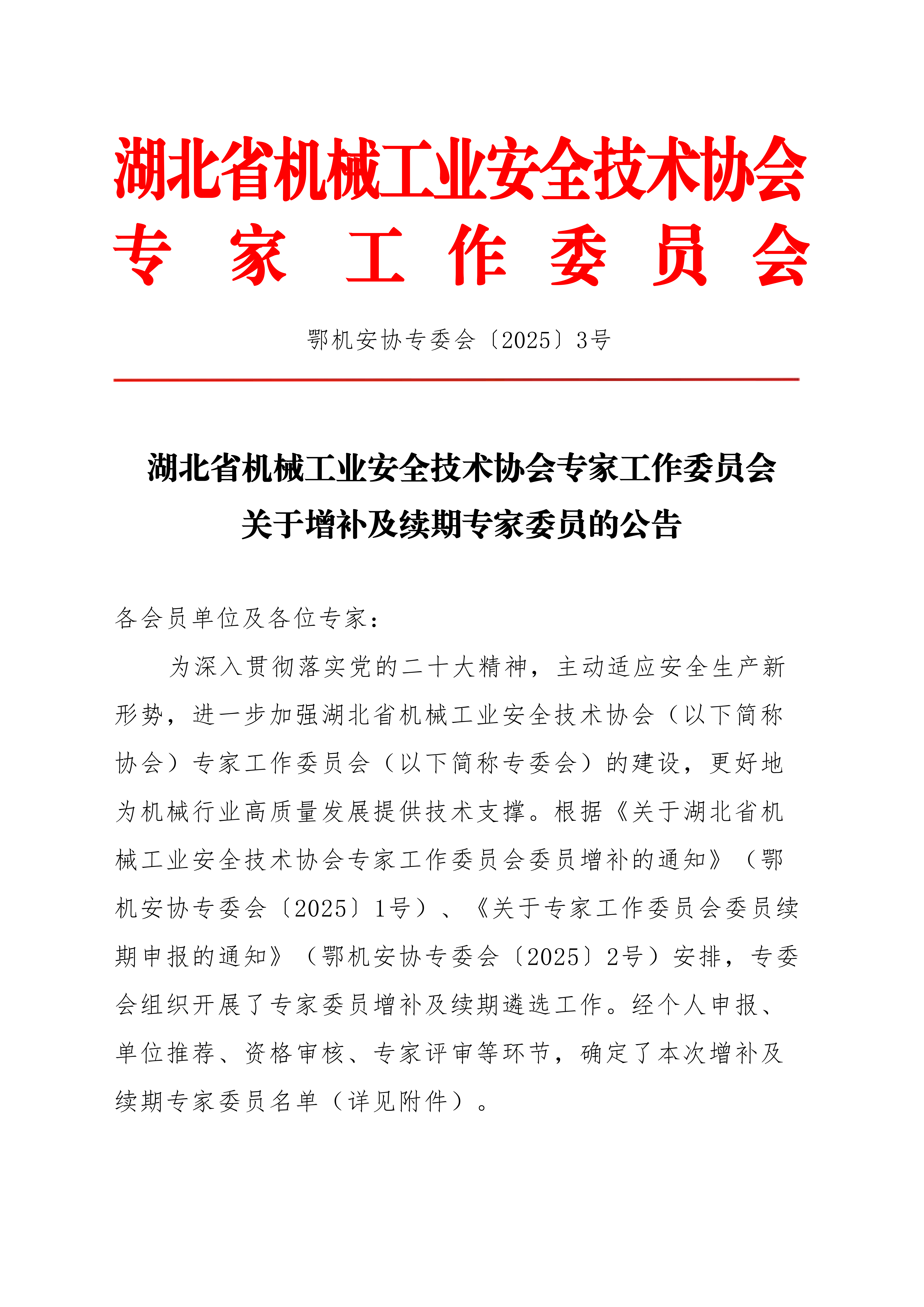 关于增补及续期专家委员的公告(鄂机安协专委会〔2025〕3号)